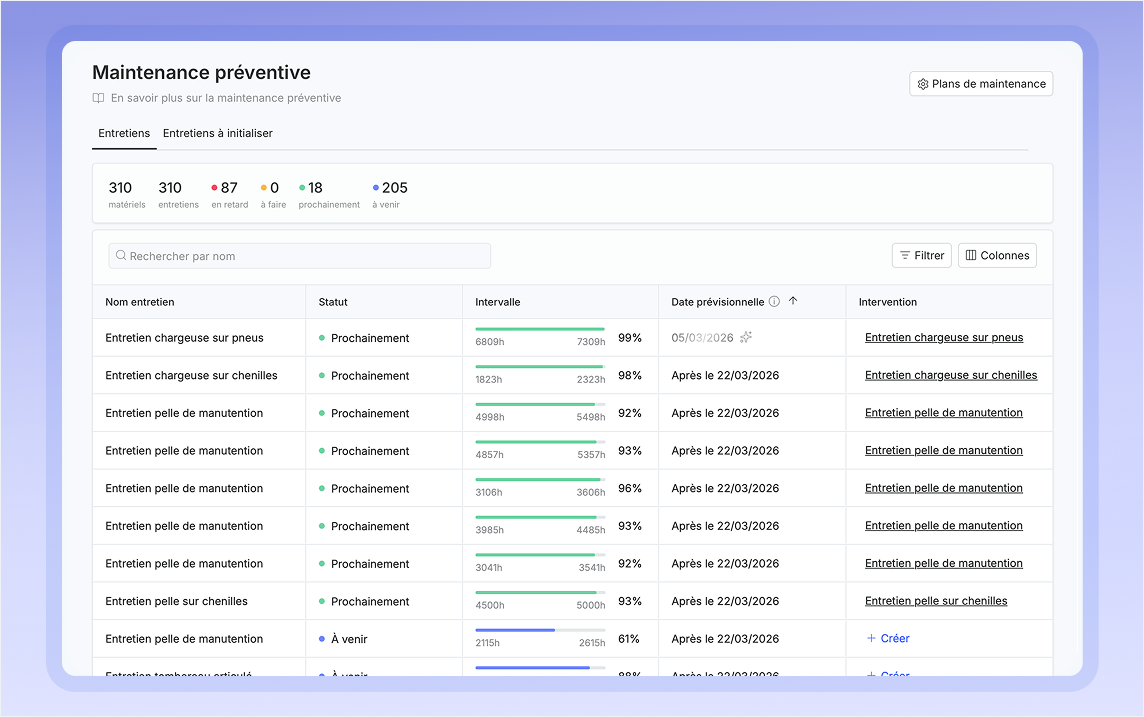 Hiboo déclenche vos opérations de maintenance directement à partir des données machines (heures, kilomètres, capteurs IoT).